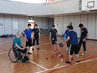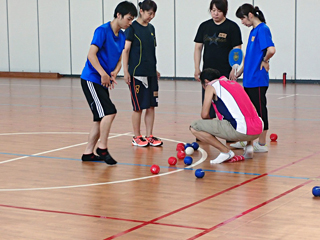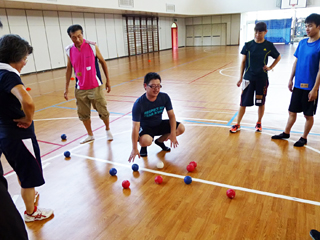 田中指導員の下、ボッチャ競技の進め方、道具、投げ方など教わった後、チームに別れ対戦をしながら、他のボールにあてたりして、いかにジャックボールと言う白いボールに近づけるかを習いました。